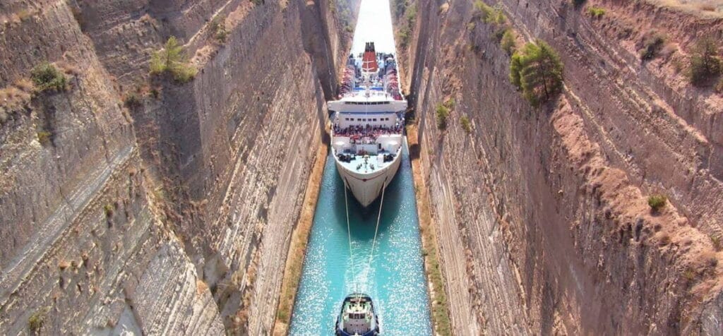 The Corinth Canal is a remarkable man-made waterway in Greece that connects the Gulf of Corinth in the Ionian Sea to the Saronic Gulf in the Aegean Sea. Carved through the narrow Isthmus of Corinth, it effectively separates the Peloponnese from the mainland, making the peninsula almost an island.
